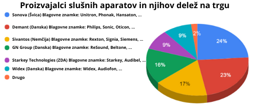 Spodnja slika prikazuje odstotek razširjenosti slušnih aparatov po koncernih oz. proizvajalcih. Vendar na zgoraj omenjeno razlago, temu ni potrebno posvečati toliko pozornosti. Največ pozornosti posvečajte vaši stopnji zadovoljstva s slušnim aparatom.
